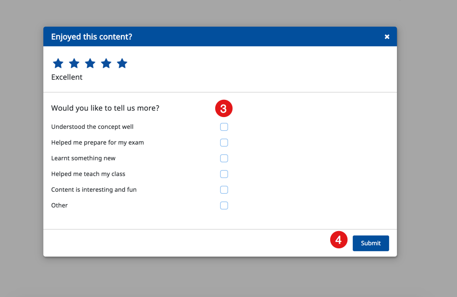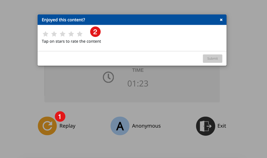 Once you complete playing the content a pop-up screen is displayed here. 2. Click the Star icons to rate the content | ![]() |