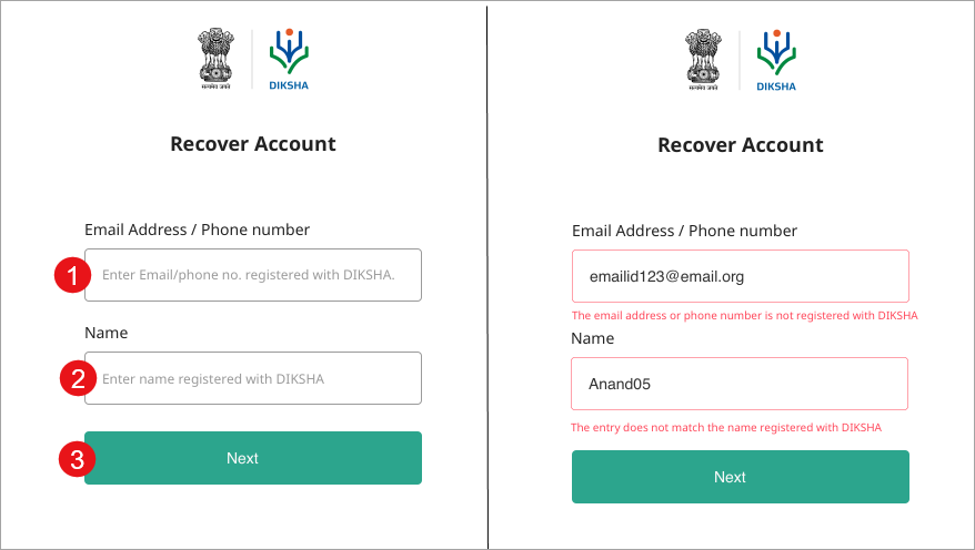 1. Enter your registered Email Address/Phone number Ensure to enter the same email address/phone number that is registered with DIKSHA. To know more refer Sign in 2. Enter the user name in Name 3. Click Next | ![]() |