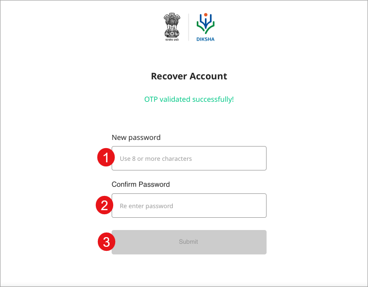 1. Enter New Password. The password should be of 8 or more characters 2. Re-enter the password in Confirm Password 3. Click Submit to change the password Sign in with your user name and the new password to recover your account | ![]() |