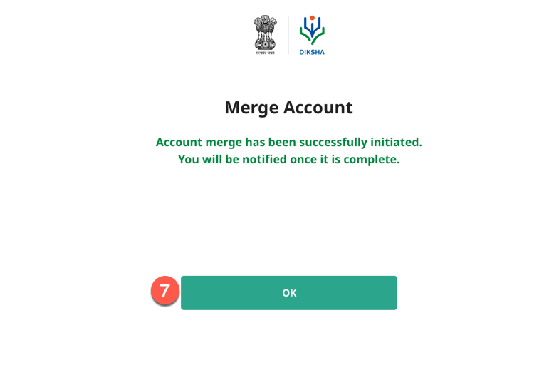 7. Click OK. Account merge is initated if the email address or phone number entered matches the details in DIKSHA records. In case, account merge fails, re-check and enter email address/phone number as registered on DIKSHA | ![]() |