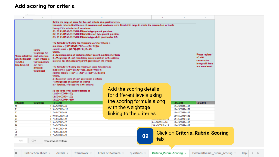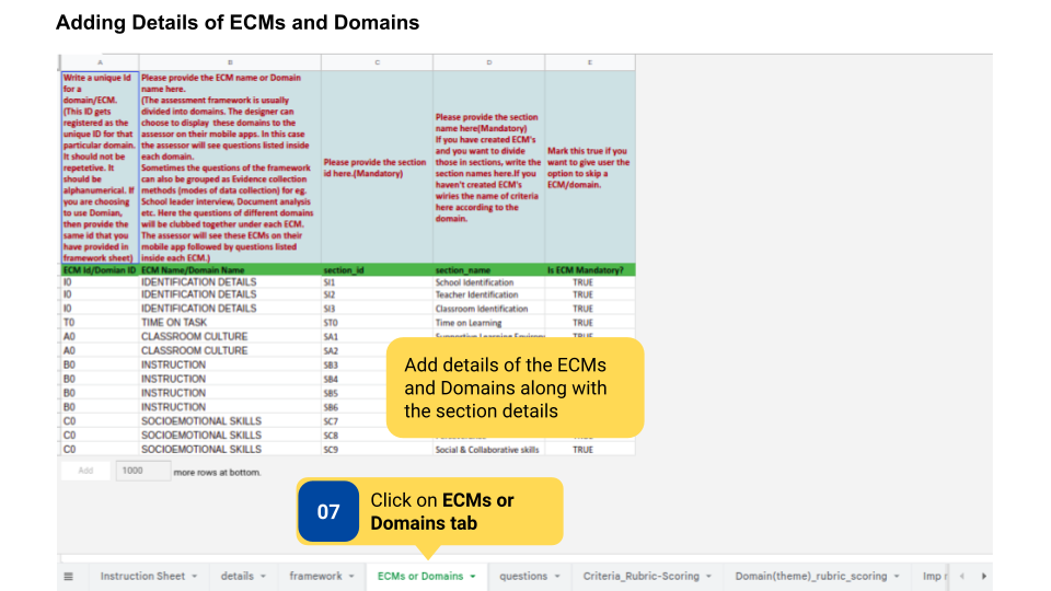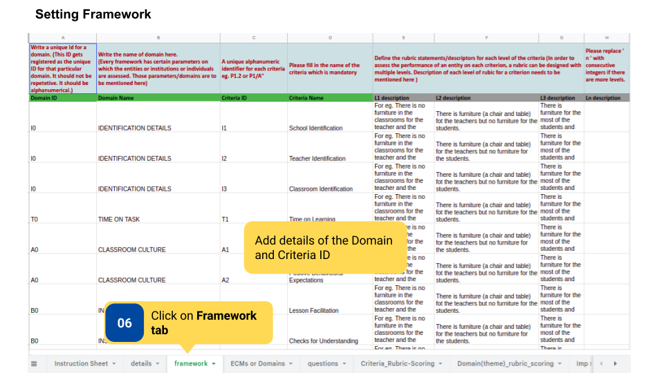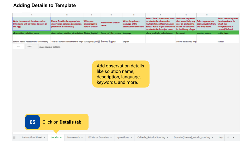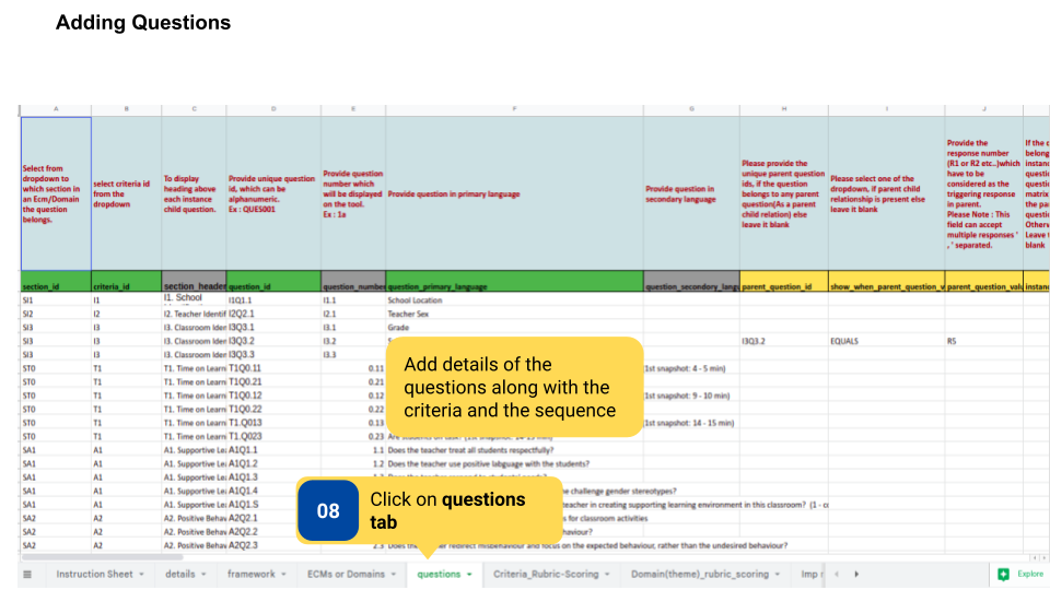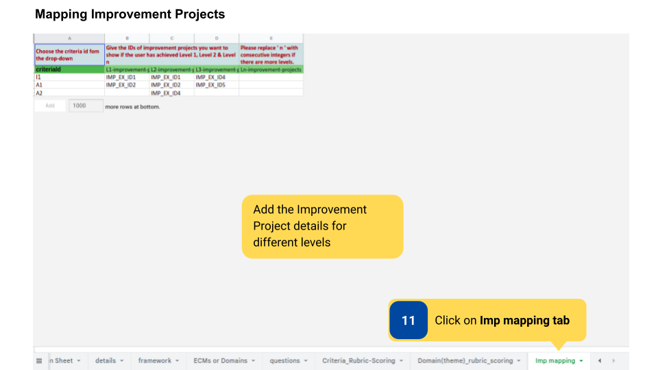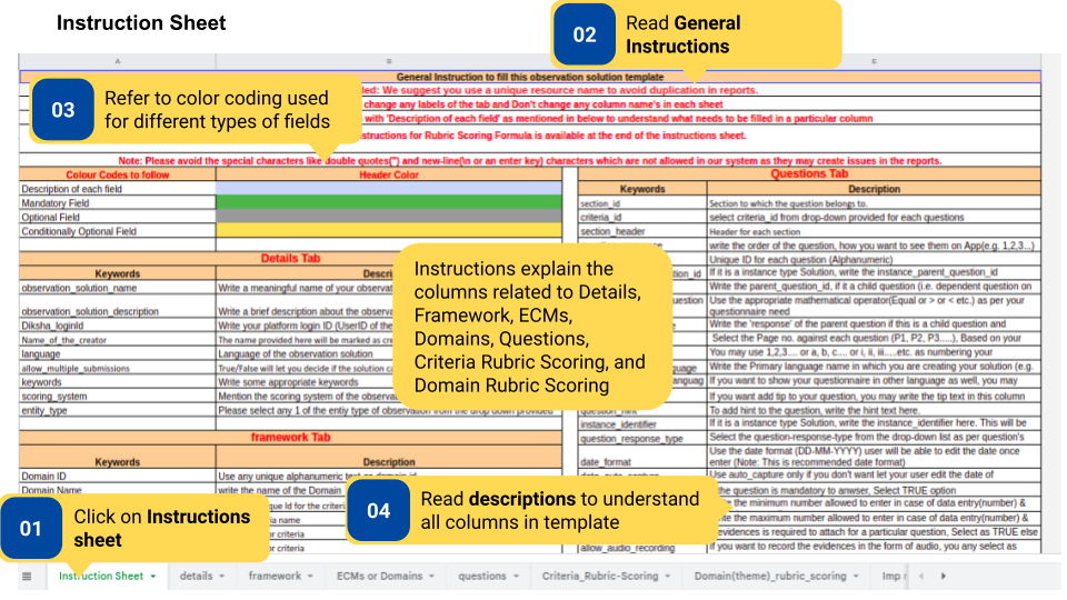 Observation-led Improvements are observations with rubrics with Improvement Projects mapped to each level. Users get suggestions for starting an Improvement Project based on the level they are at after completing the observation. There are 8 tabs in Observation without rubric- Instructions, Details, Framework, ECMs or Domains, Questions, Criteria Rubric Scoring, Domain Rubric Scoring, Imp Mapping. The template is colour-coded for description of columns, mandatory fields, optional fields, and conditionally optional fields, so that the content creator knows what to fill.
