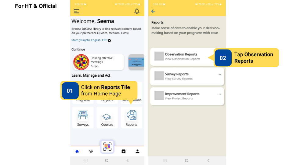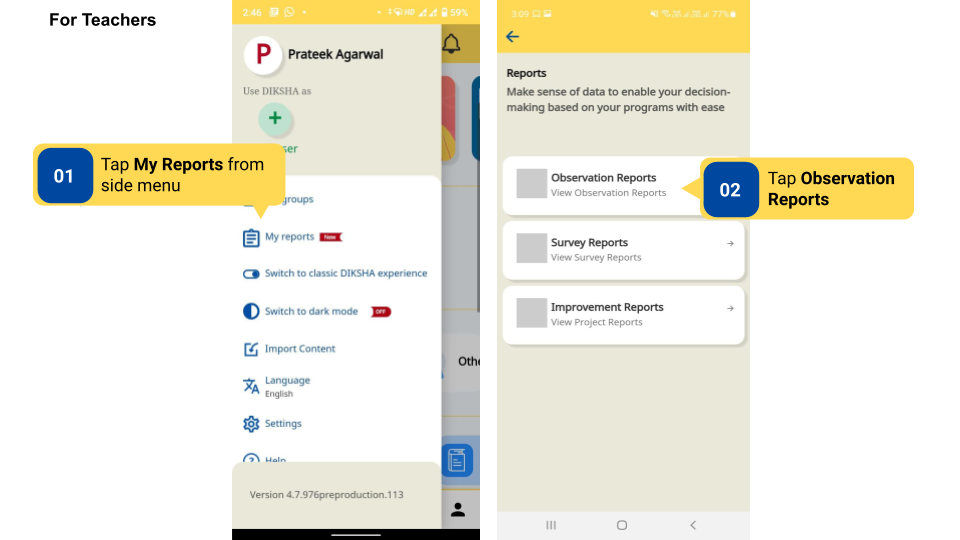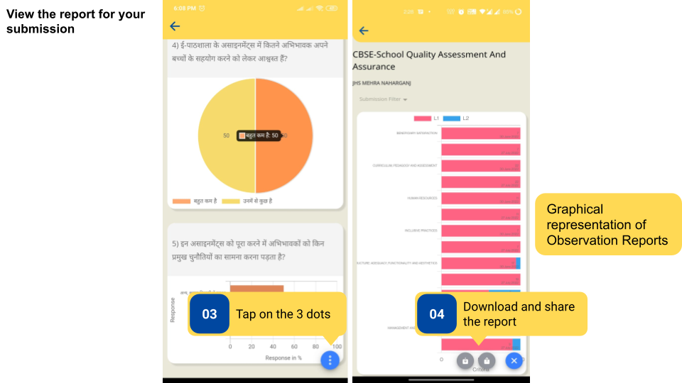 On the DIKSHA app, reports are generated for the Observation after submission. Reports can also be shared and downloaded as PDF.