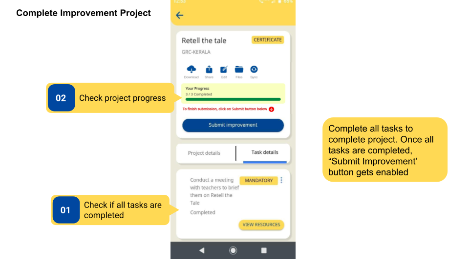 An Improvement Project is marked completed only when all its tasks and subtasks are completed. Users can check the progress of their project in the progress bar section.