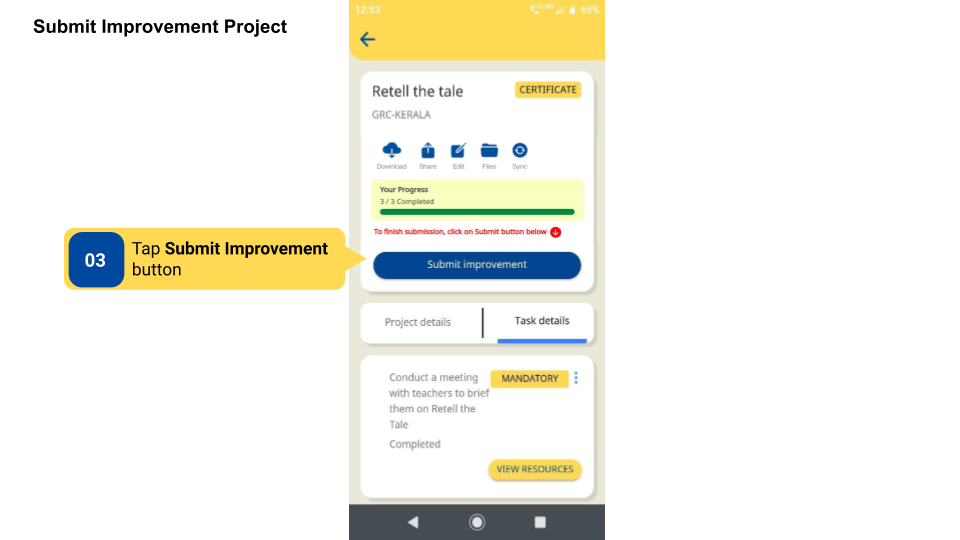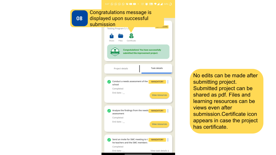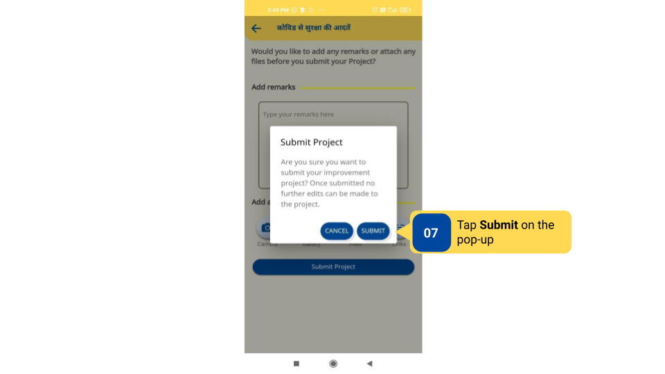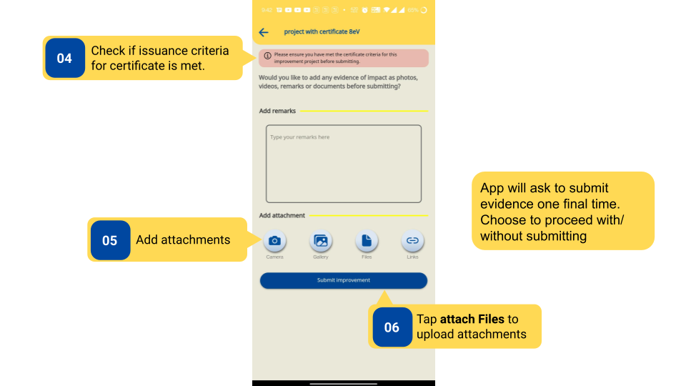 Once all tasks have been completed in an Improvement Project, the Submit Improvement button gets enabled, and users can submit their project. Users will be asked to upload files or evidence one final time before submitting the project. Users can choose to add more files or evidence or proceed to submit the project without it. Certificates attached to Projects will only be issued to users if the issuance criteria have been met during submission.