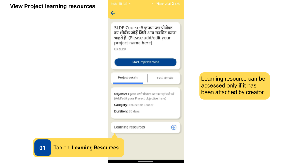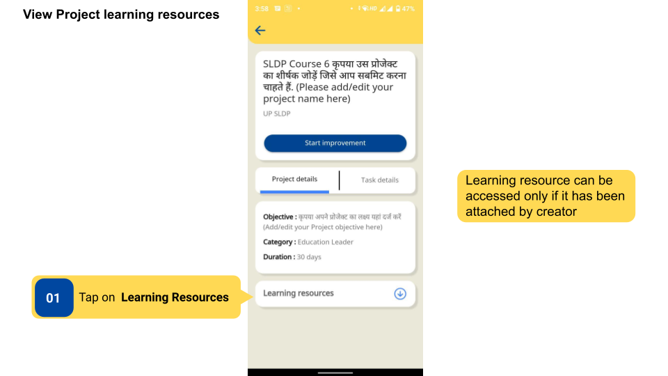 Improvement Projects may have learning resources that help users gain a broader understanding before starting a project. Learning Resources are not mandatory to be taken up for the completion of the project.