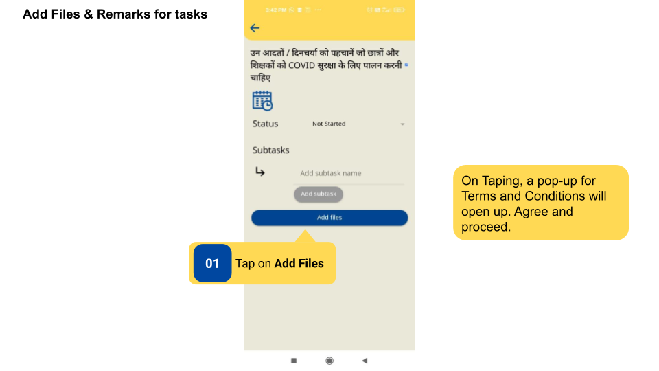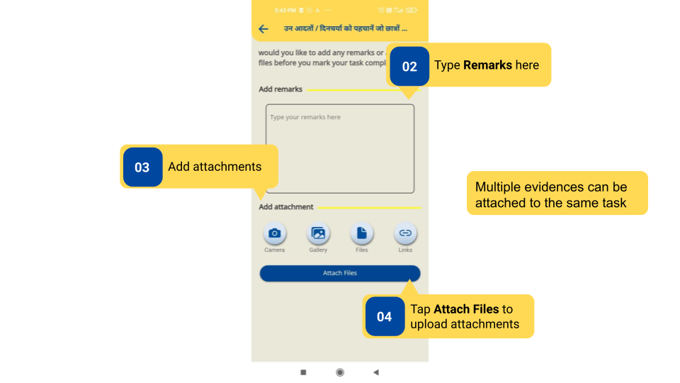 Users can add multiple evidences as images, videos, PDF files, and links to each task. Any specific remarks can also be typed.