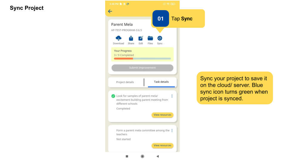 Users can sync their project to the cloud or server by clicking on the Sync button. Syncing means uploading the project details to the DIKSHA Database. Without syncing a project, the data is only saved on the user’s device. In case of app uninstallation or cache clearing, the project data will get deleted if it is not synced to the server. Without syncing the project, the data will also not reflect in the dashboard, and states will not receive information about project completion.