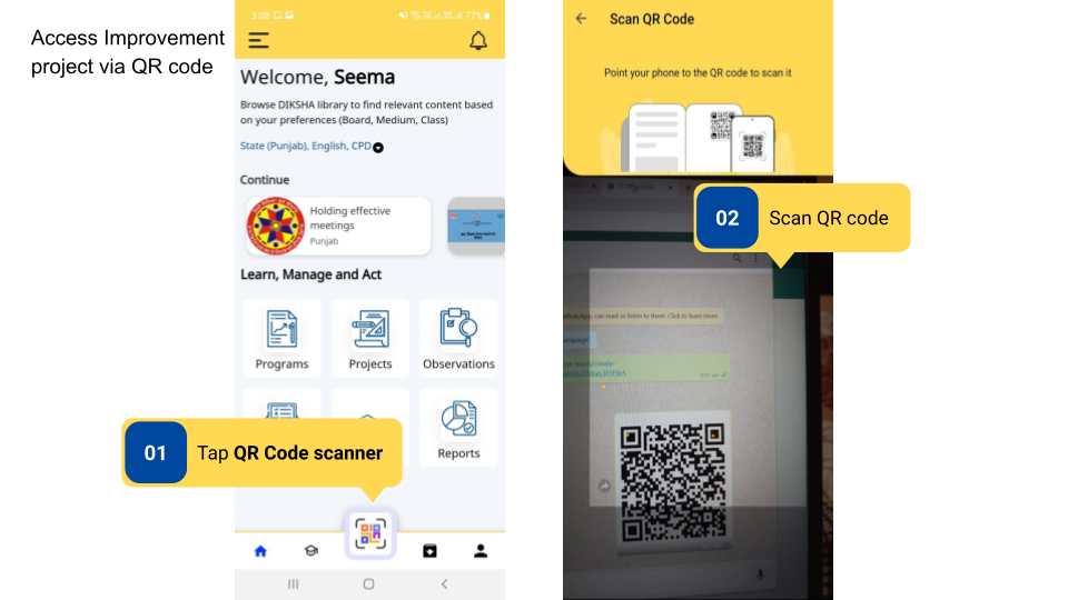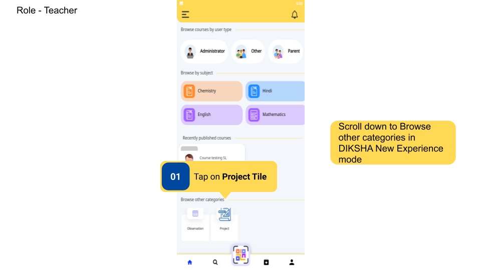 Teachers can access the improvement project from the project tile in the Browse other categories section, through links and QR codes. Project tile for Teachers is available only if it has been enabled for the board. DIKSHA state coordinators can request the DIKSHA Support Team to enable Project tile.