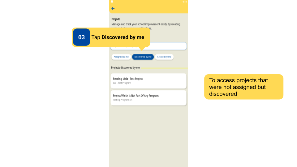 Projects that are not directly mapped to the role selected in the profile but were shared through Link or QR Code will appear in the Discovered by me Section.