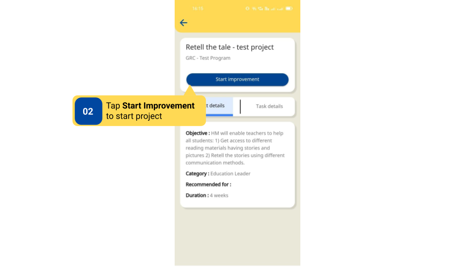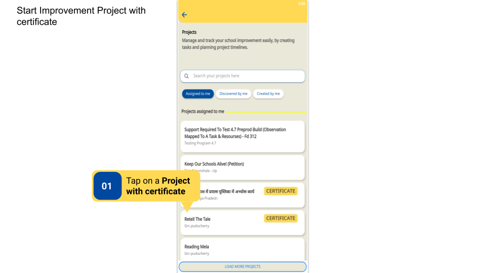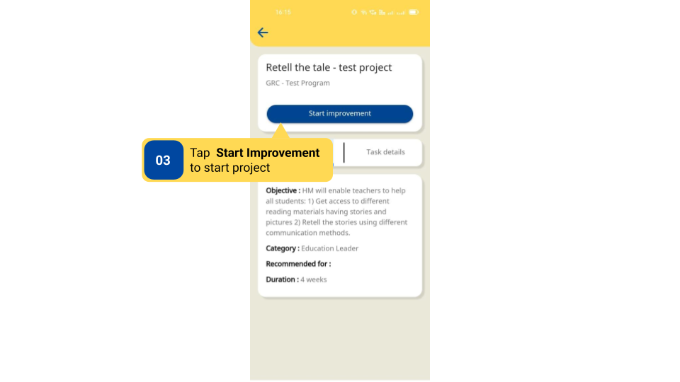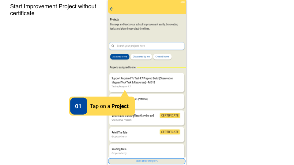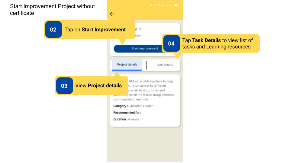 DIKSHA Improvement Projects are created by Content Creator. They can be viewed only by signed-in users who are logged in either as HT & officials or Teachers.