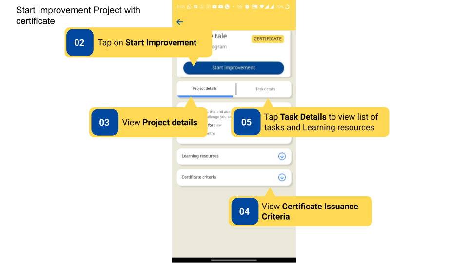 Improvement Projects are designed to help users’ improvement journey with actionable easy tasks. Each Improvement Project has objectives, timelines, and lists of tasks in the project. Some Improvement Projects may also have certificates attached.