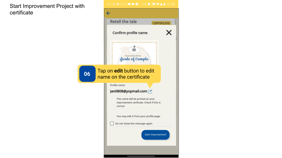Projects with certificate can be identified by the certificate tag. Certificates are issued if the issuance criteria is met during project submission. The name on the certificate can be edited only during the beginning of the project through ‘confirm profile name’ pop-up.